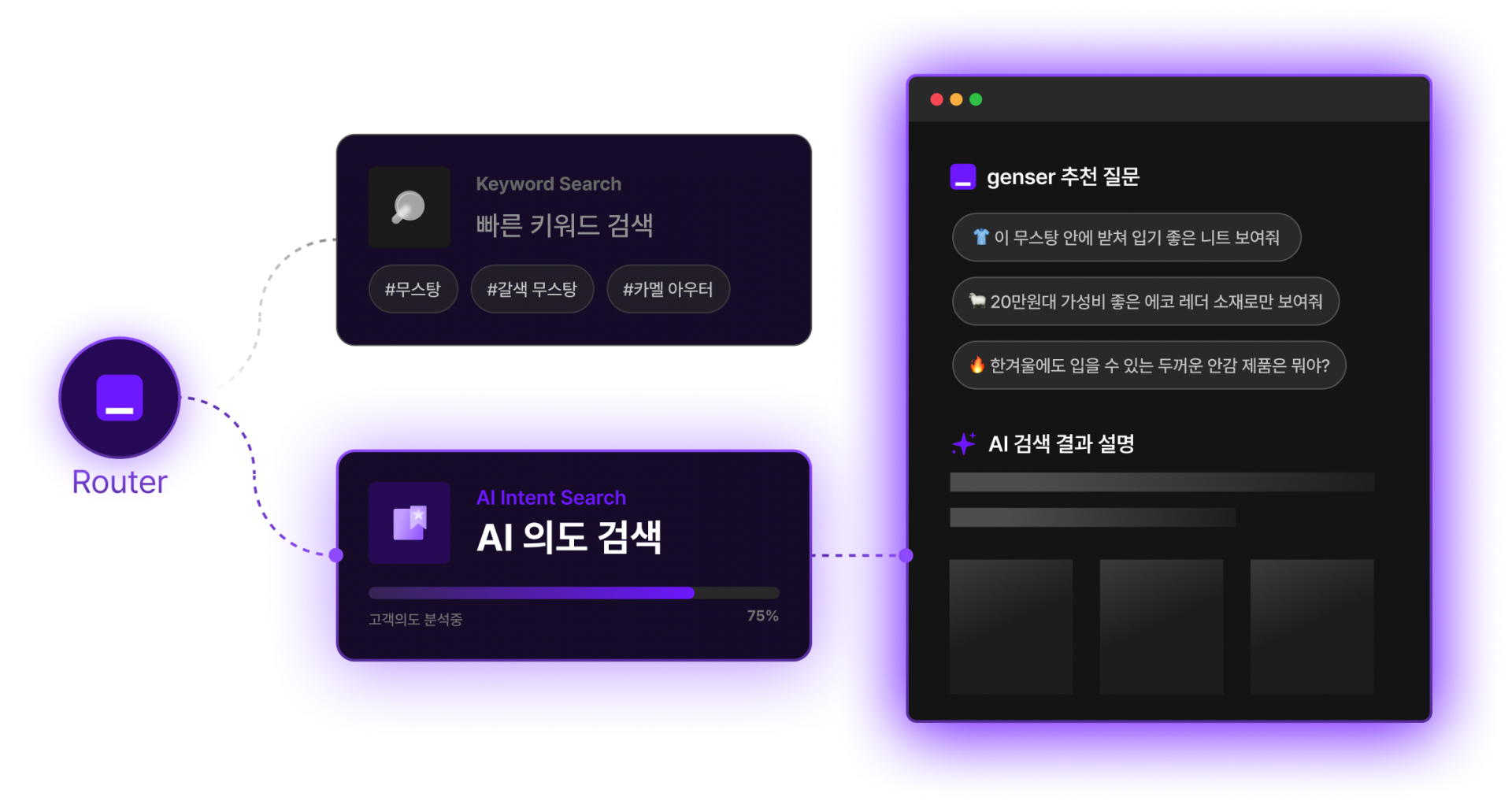 genser_의 Auto Routing은 고객의 입력을 실시간으로 분석해 단순 키워드 탐색과 AI 의도 분석 중 최적의 경로를 자동 선택합니다. 검색 상황에 맞는 흐름을 제공함으로써 불필요한 탐색을 줄이고 고객이 가장 짧은 거리로 만족스러운 결과에 도달하도록 돕습니다.